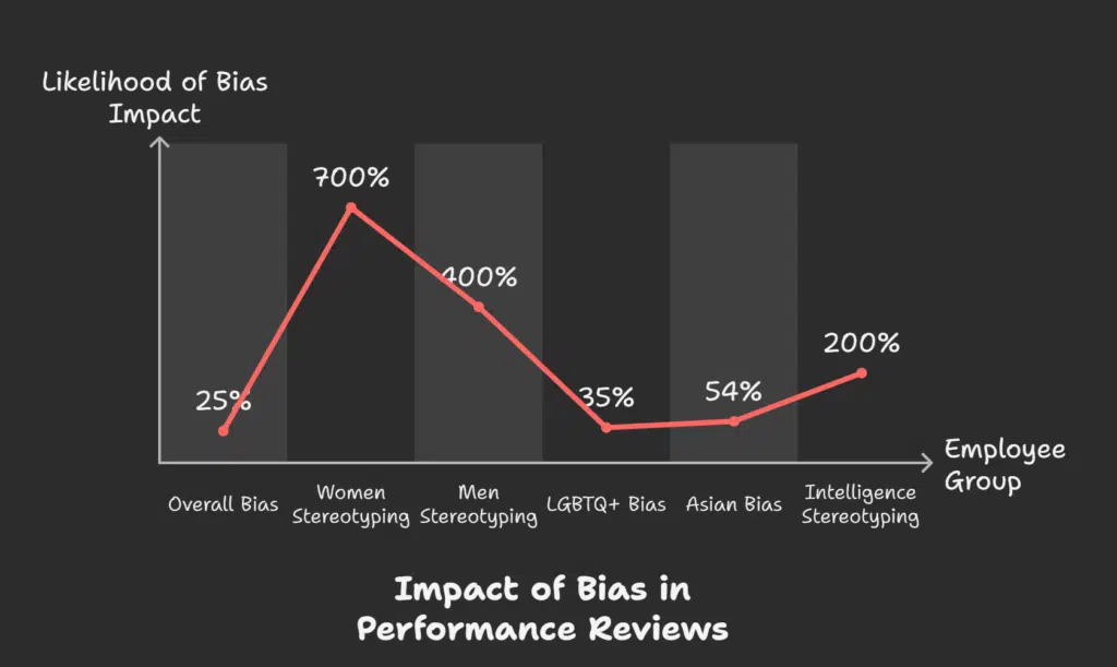 The impact extends across demographics: LGBTQ+ employees are 35% more likely to report that their supervisor’s personal biases negatively impacted their performance reviews, while for Asian employees, that number jumps to 54%.