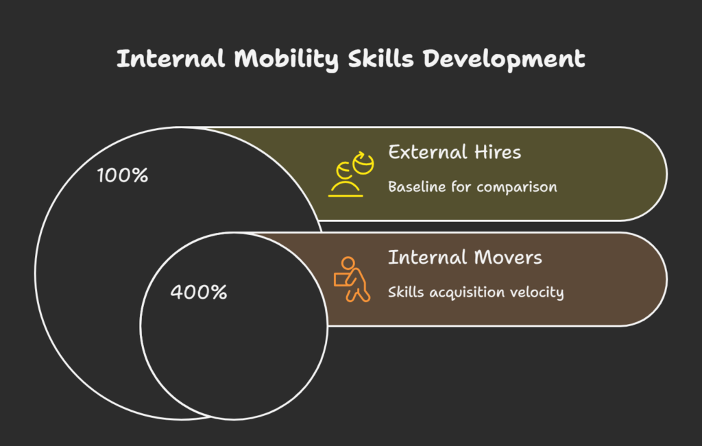 But cost savings are just the beginning. Consider this: Internal mobility participants acquire new skills 4x faster than their peers. That’s not a typo. Four times faster. When employees move within your organization, they’re already familiar with your culture, processes, and systems. They can focus entirely on developing new competencies instead of learning everything from scratch.
